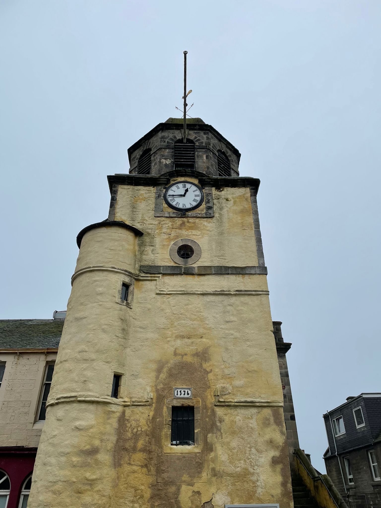 “In 1617 the Town Hall was built alongside the old Tolbooth, the upper stages of which were wrecked by an explosion in 1656 and not rebuilt until 1707. The building housed the public weights-and-measures office, guard-house and prison; the Town Council met here weekly after 1617. A clock was introduced as early as 1592, and the current mechanism and clock faces were installed in 1876.”